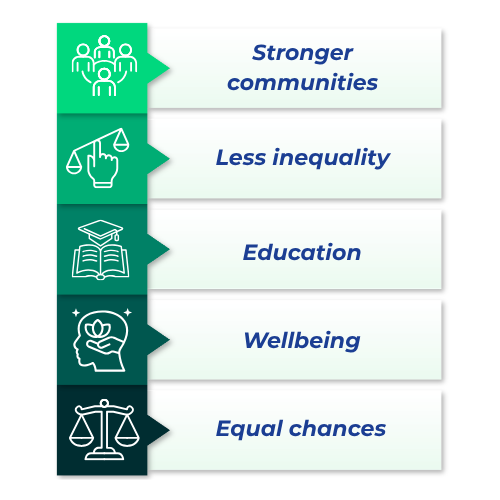 TDS measures success across five areas: stronger communities, less inequality, education, wellbeing, and equal chances. Safe House helps by:
